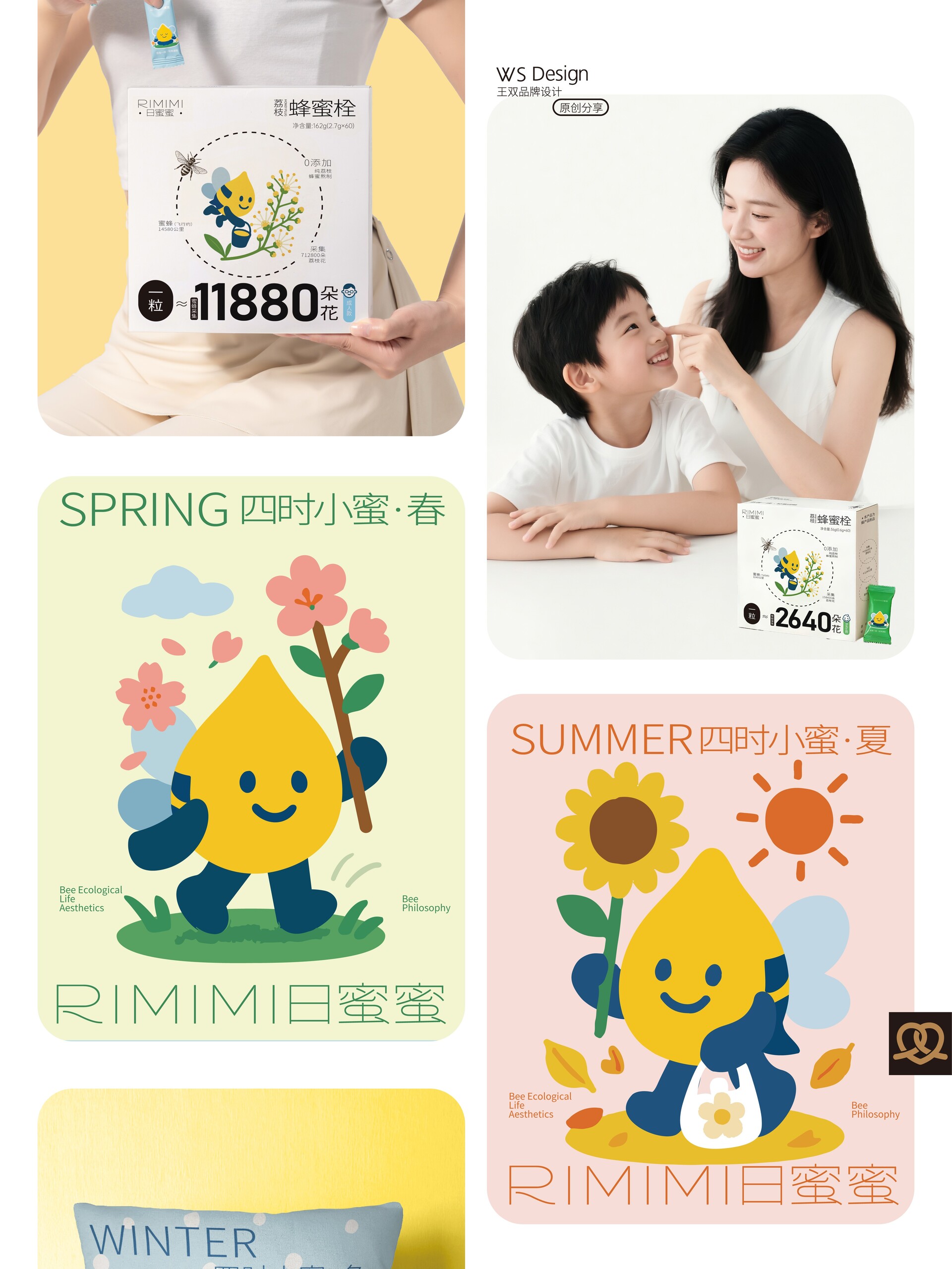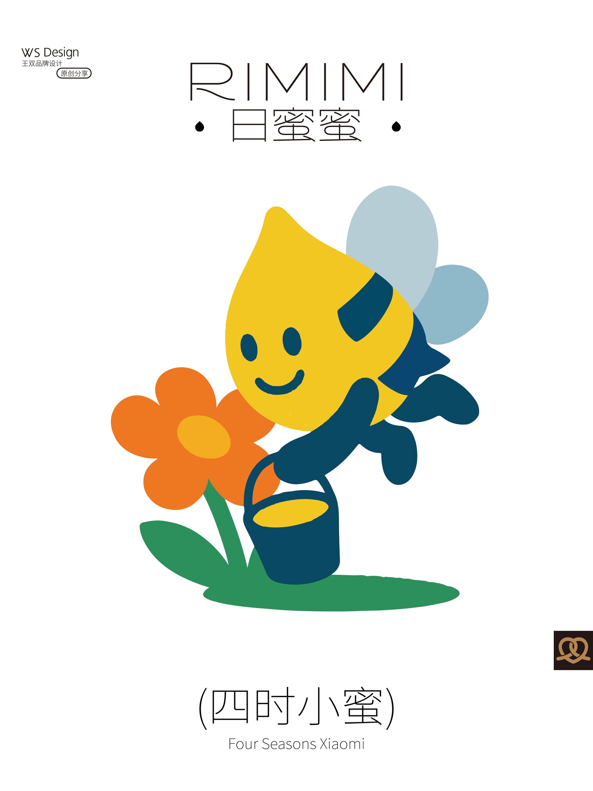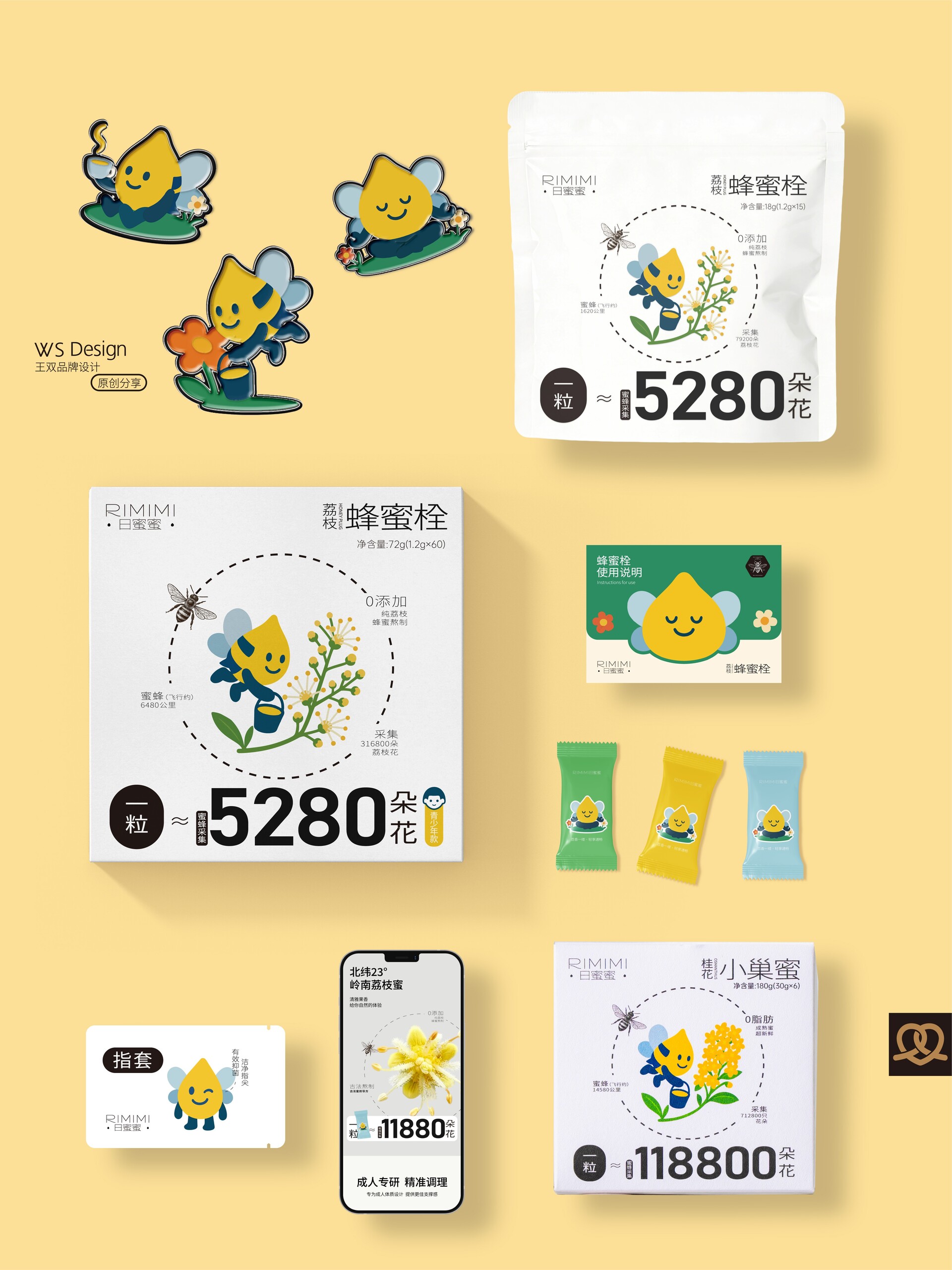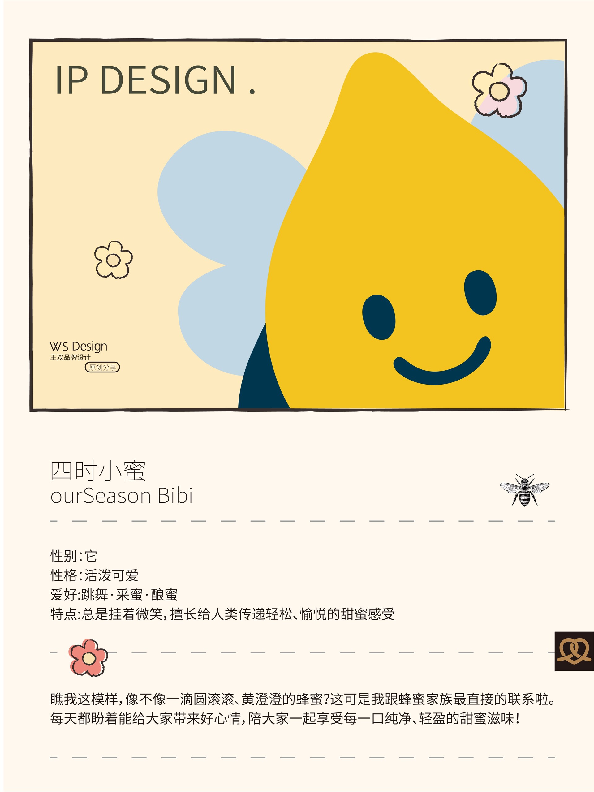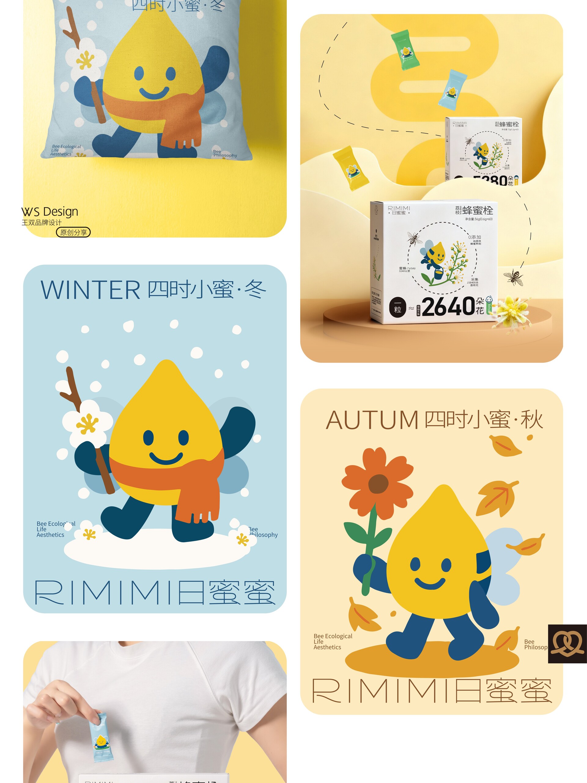 原创品牌ip设计|日蜜蜜原创品牌ip设计|日蜜蜜 Original brand IP design|RIMIMI 结合“四季·花·疗效·蜜蜂·生活方式”五个关键词,作为“日蜜蜜”品牌的卡通IP。 这个IP角色是一滴金黄色的蜂蜜滴,整体为水滴形,融合了蜜蜂的翅膀、尾刺、触角与条纹等元素,既具备天然感,又有生命力。它象征着自然智慧、勤奋采撷与甜蜜滋养。 Combining five keywords—"Four Seasons, Flowers, Healing Effects, Bees, and Lifestyle"—this character serves as the cartoon IP for the "RiMiMi" brand. The IP character is a drop of golden honey, shaped like a teardrop, incorporating elements such as bee wings, stinger, antennae, and stripes, conveying both a natural feel and vitality. It symbolizes natural wisdom, diligent gathering, and sweet nourishment.