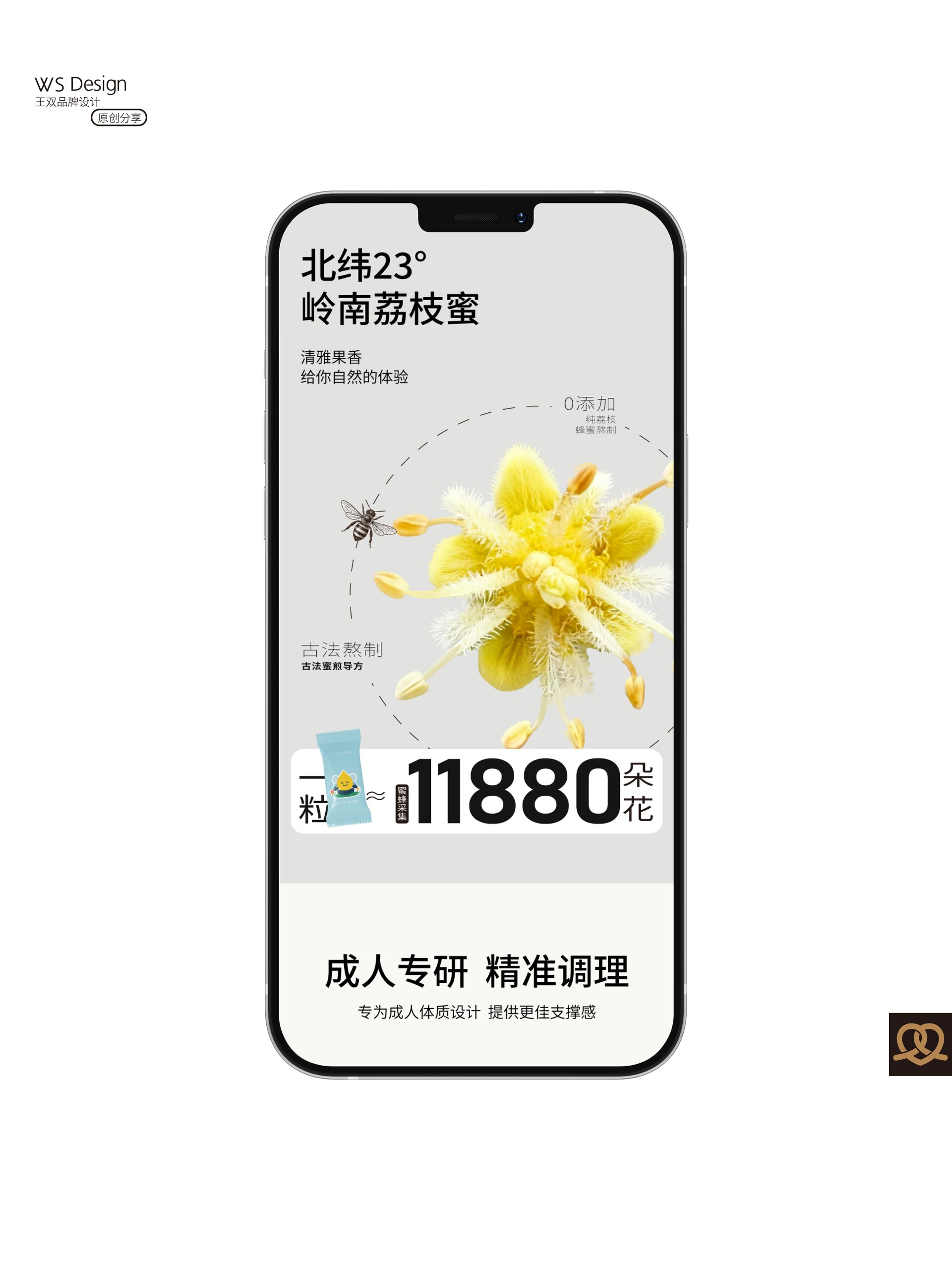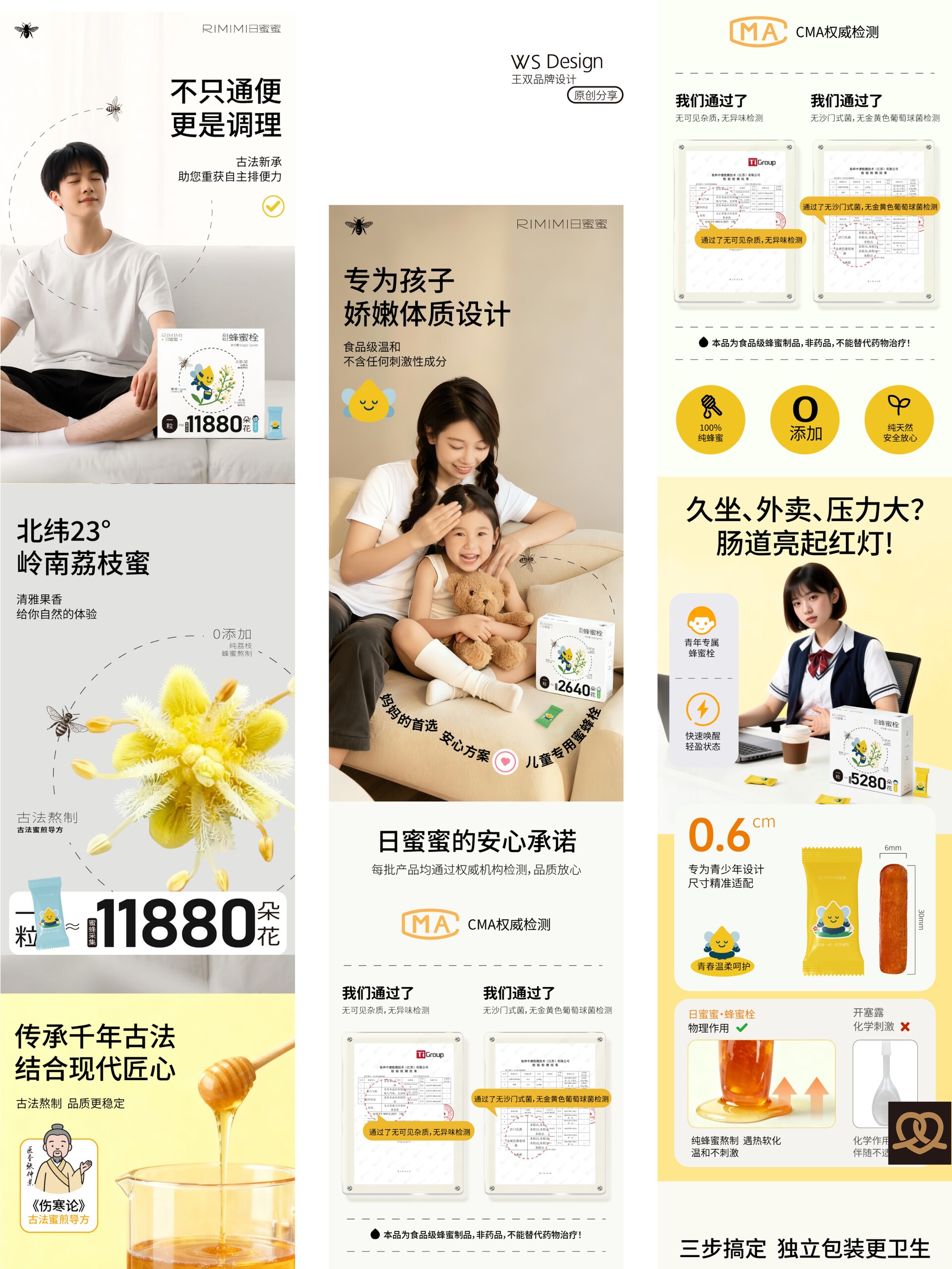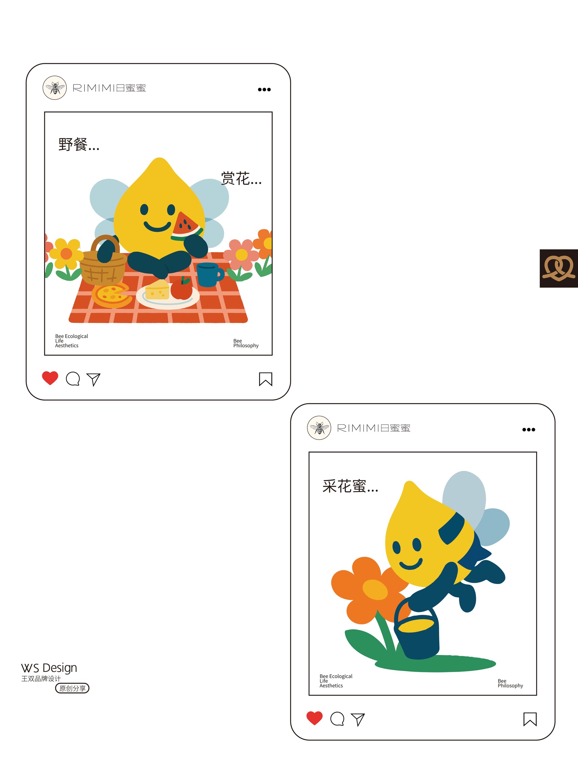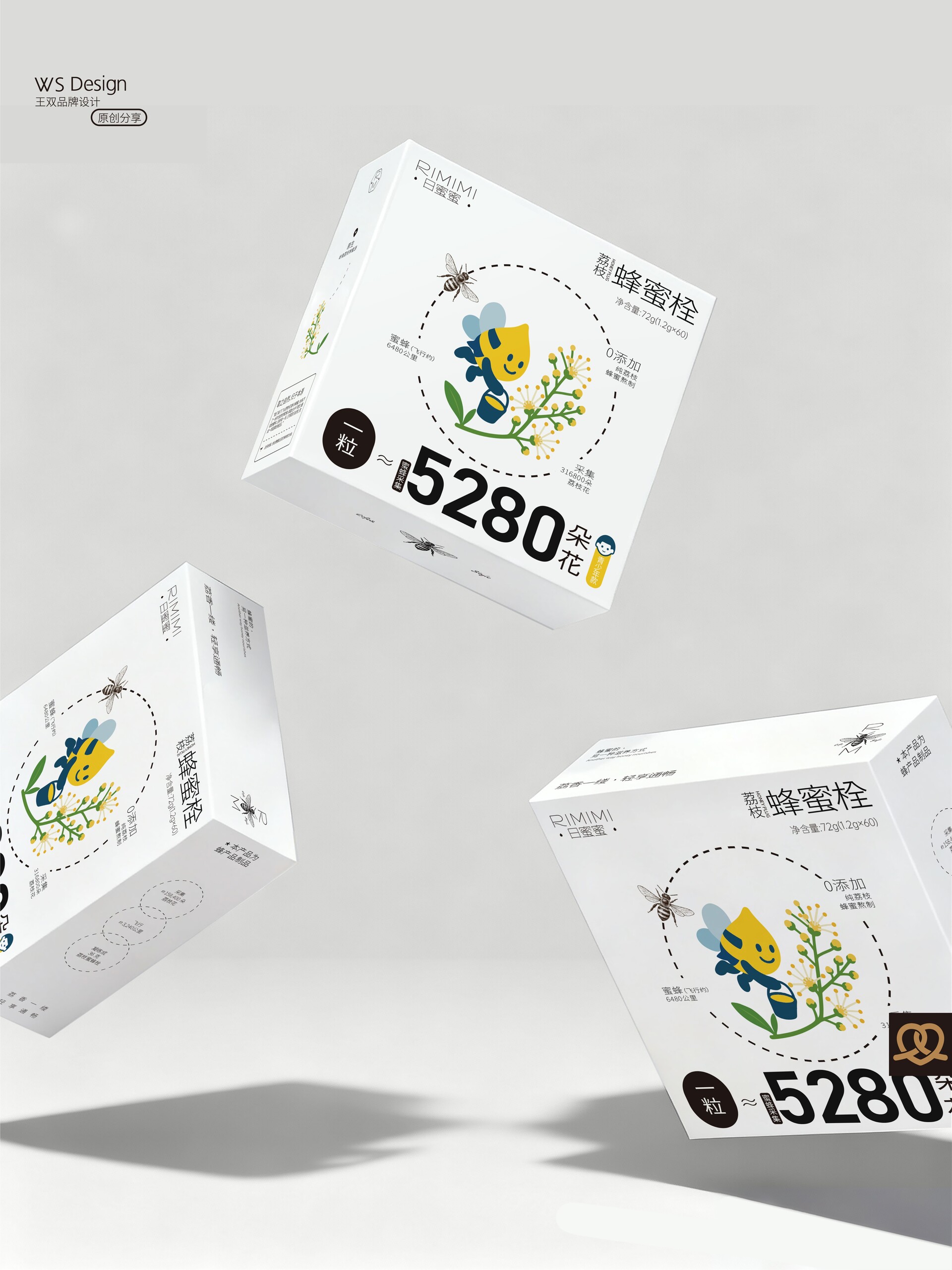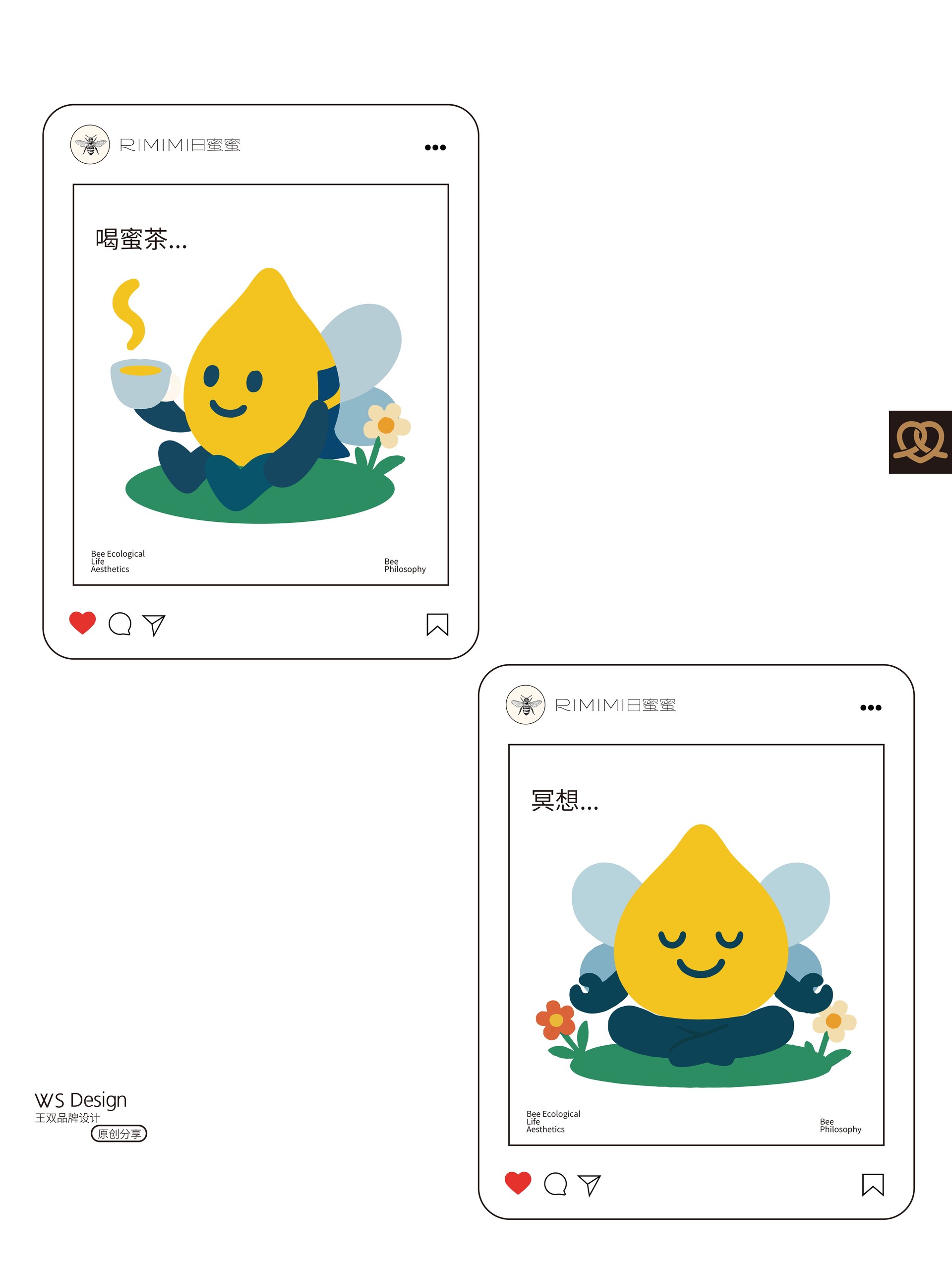 原创品牌ip设计|日蜜蜜原创品牌ip设计|日蜜蜜 Original brand IP design|RIMIMI 结合“四季·花·疗效·蜜蜂·生活方式”五个关键词,作为“日蜜蜜”品牌的卡通IP。 这个IP角色是一滴金黄色的蜂蜜滴,整体为水滴形,融合了蜜蜂的翅膀、尾刺、触角与条纹等元素,既具备天然感,又有生命力。它象征着自然智慧、勤奋采撷与甜蜜滋养。 Combining five keywords—"Four Seasons, Flowers, Healing Effects, Bees, and Lifestyle"—this character serves as the cartoon IP for the "RiMiMi" brand. The IP character is a drop of golden honey, shaped like a teardrop, incorporating elements such as bee wings, stinger, antennae, and stripes, conveying both a natural feel and vitality. It symbolizes natural wisdom, diligent gathering, and sweet nourishment.